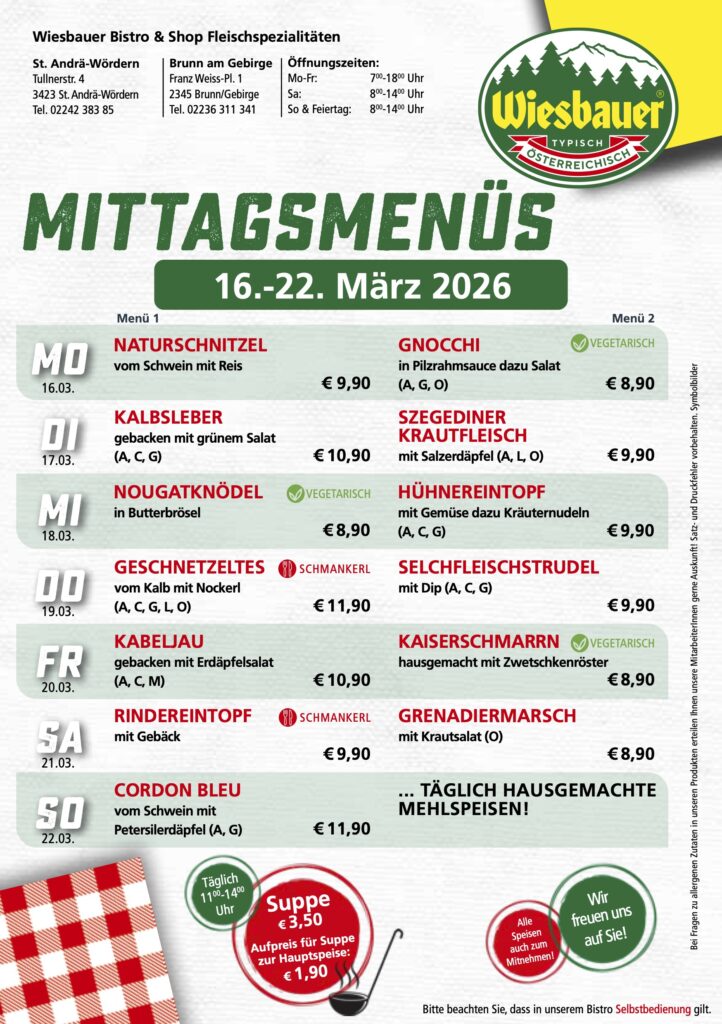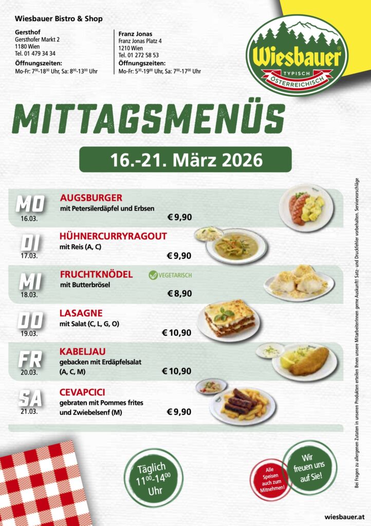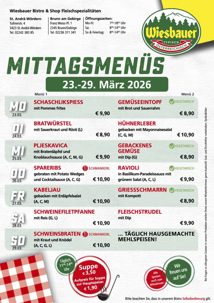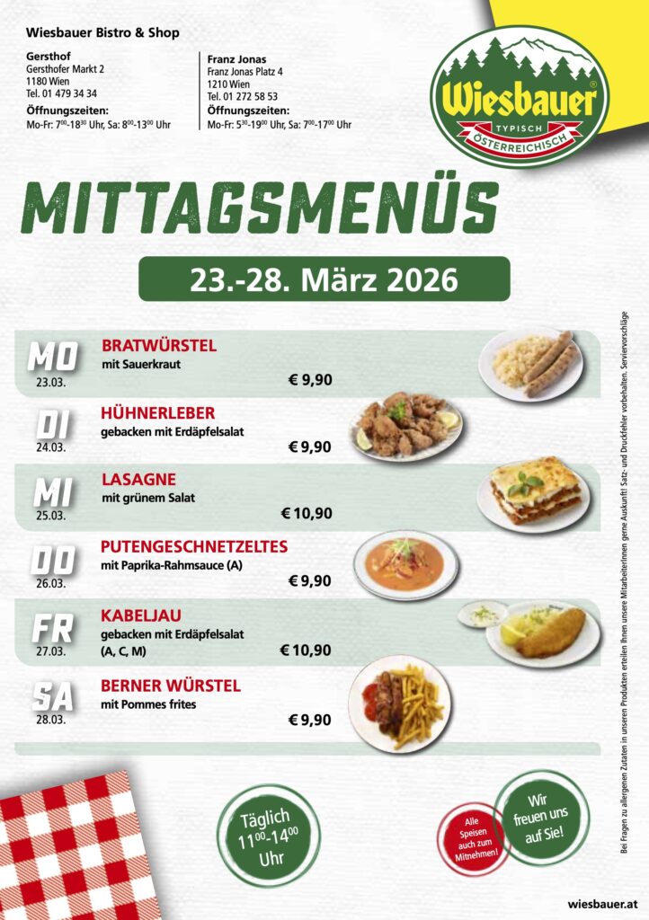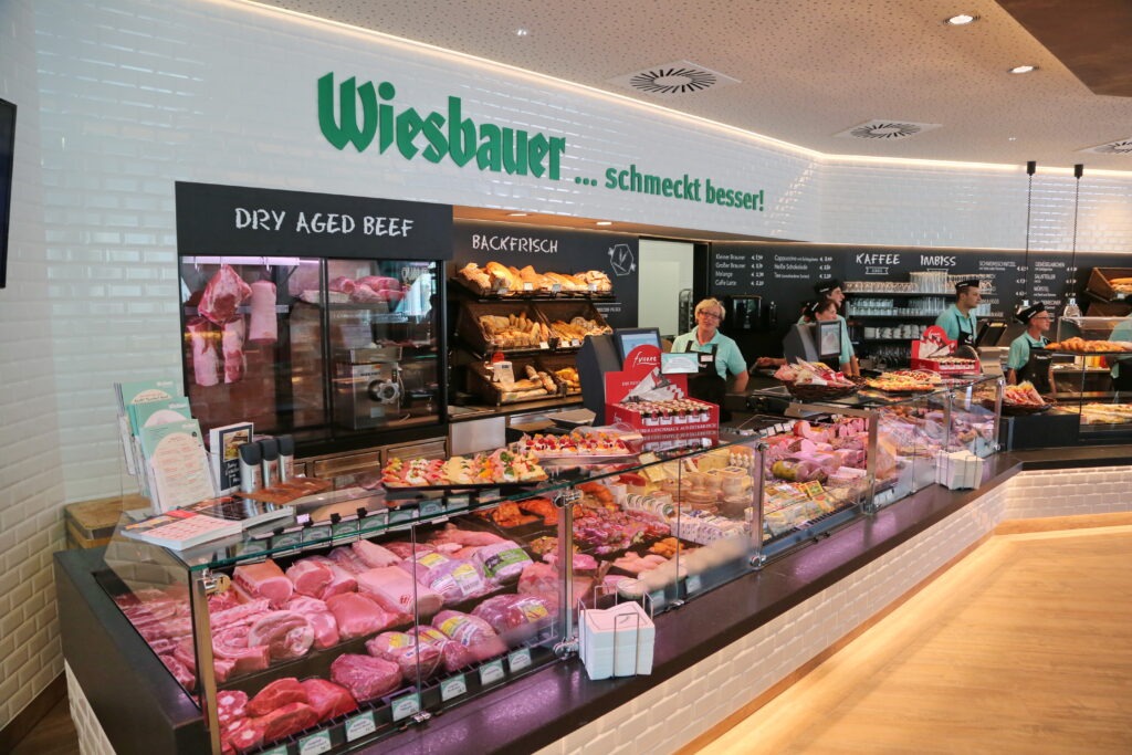 „Wiesbauer bistro & shop“ ist ein seit Jahren am Markt etabliertes Konzept an mehreren Standorten in Niederösterreich und Wien. An den drei Standorten Brunn am Gebirge, St. Andrä – Wördern und Gersthof haben Sie zusätzlich zu unserem breiten Fleisch- und Wurstangebot, auch die Möglichkeit unsere frisch zubereiteten Mittagsmenüs zu genießen. Die bistro & shop-Filialen werden als Selbstbedienungs-Lokale geführt. Das Sortiment wechselt ständig nach Nachfrage sowie Saisonalität und wird täglich frisch produziert. Entsprechend dem Wiesbauer Leitsatz „Unser Ziel ist der begeisterte Kunde“ erheben wir laufend über Kundengespräche die Kundenwünsche und führen Evaluierungen unserer Angebotsstruktur durch. Das Sortiment richtet sich nach diesem Kundenbedarf, wird regelmäßig überprüft und laufend adaptiert.