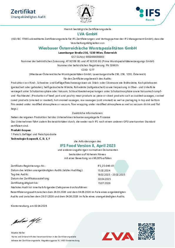 Wir sind sehr stolz darauf, dass erneut alle vier Produktionsbetriebe von Wiesbauer in Wien-Liesing, Sitzenberg-Reidling (Niederösterreich), Saalbach (Salzburg) und Gönyü (Ungarn) nach IFS – International Featured Standards: Food – zertifiziert wurden. Und zwar allesamt auf „höherem Niveau“! Damit ist einmal mehr offiziell bestätigt, dass Wiesbauer den höchsten Ansprüchen an Qualität und Produktsicherheit in der Lebensmittelbranche gerecht wird. Heute und in Zukunft – denn die IFS-Zertifizierung muss jährlich erneuert werden.
