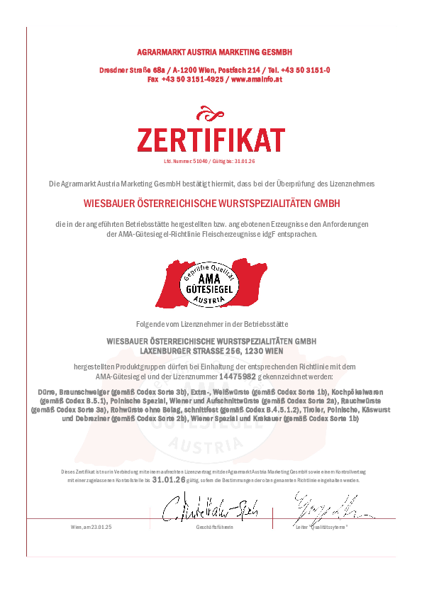 Unsere ausgewählten Wurstspezialitäten mit AMA-Gütesiegel werden nach den hohen Qualitäts-Kriterien der Agrarmarkt Austria Marketing (AMA) produziert und von unabhängigen Stellen geprüft. Neben der Verarbeitung von ausschließlich österreichischem Fleisch sehen die Richtlinien unter anderem besondere Standards bei der Tierhaltung, Fütterung und Hygiene vor.