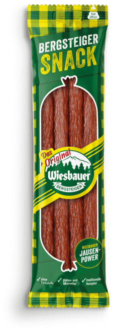 Großer Geschmack im Snackformat: Der Bergsteiger Snack ist eine Neuinterpretation unseres beliebten Klassikers. Nach dem Vorbild der original Wiesbauer Bergsteiger ist der Bergsteiger Snack eine g’schmackige, sorgsam über Buchenholz geräucherte Dauerwurst für zwischendurch und unterwegs.
