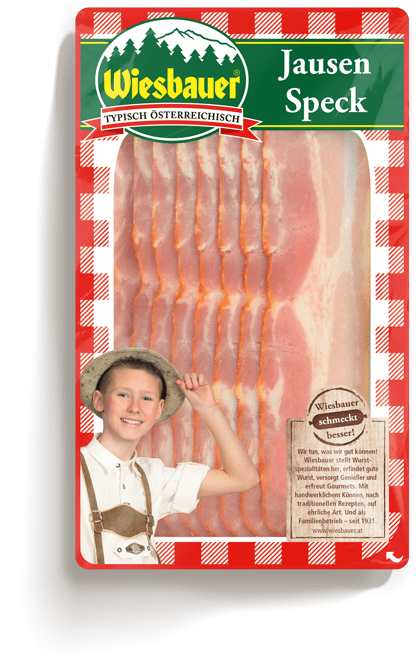 Unseren Jausen Speck gibt es zart aufgeschnitten in der 80g Packung im gut sortieren Kühlregal.