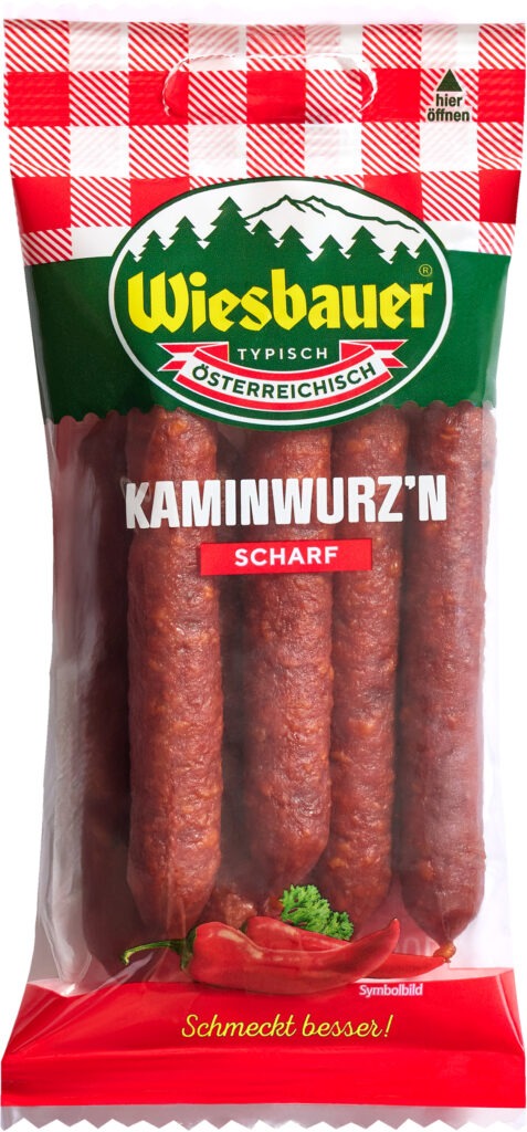 Nach der erfolgreichen Markteinführung der „Kaminwurz’n klassik“ hat Wiesbauer sein Fingerfood-Sortiment um ein weiteres Produkt, die „Kaminwurz’n scharf“, erweitert. Das Geheimnis des scharfen Geschmackes „liegt“ in der Pfefferoni.