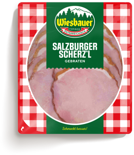 Frisch und hauchdünn auf geschnitten in der praktischen 80g Packung ist das „Salzburger Scherz’l“ genauso ein Genuss.