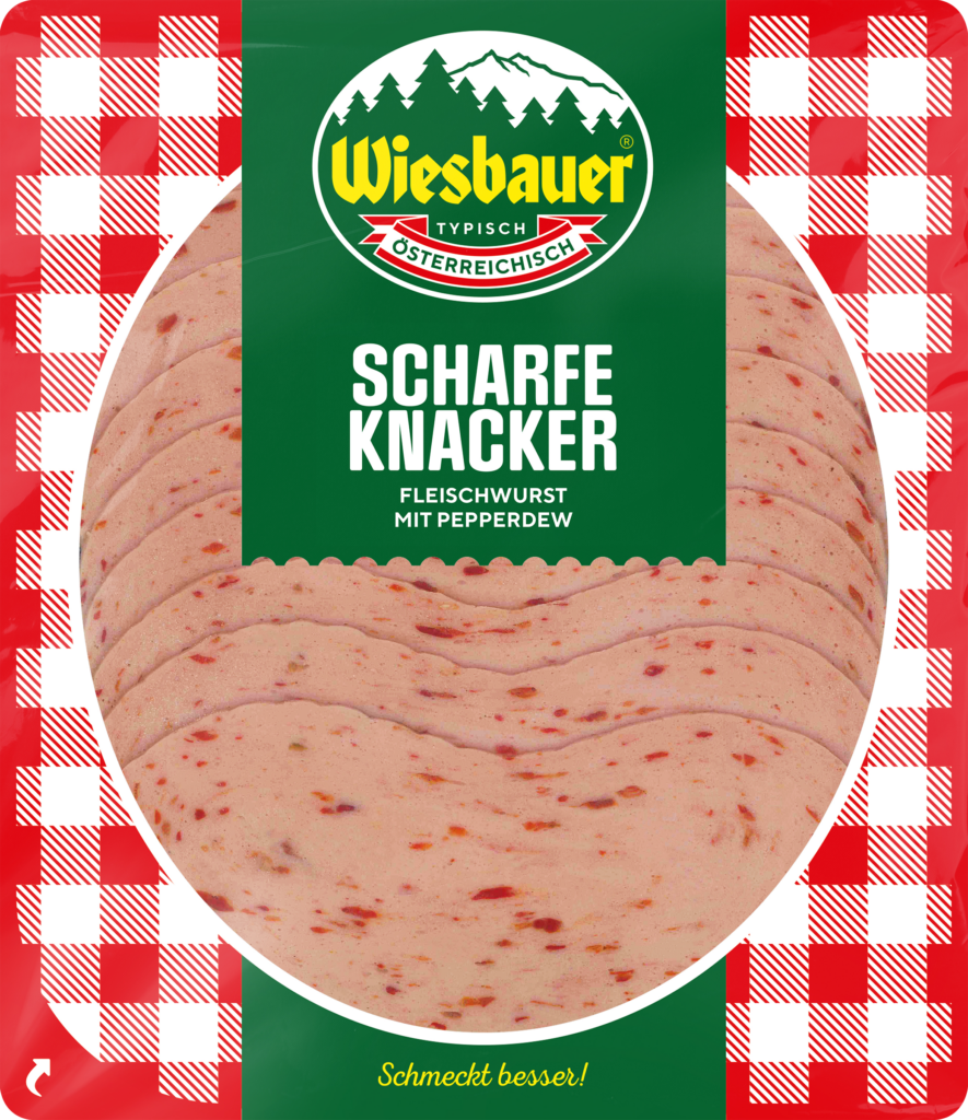 Diese Fleischwurst eignet sich ideal als fein aufgeschnittene klassische Knacker mit scharfem Pepperdew, der im Produkte gut sichtbar ist, in eine Semmel, auf eine Scheibe Brot oder als Vorspeise in Essig und Öl.
