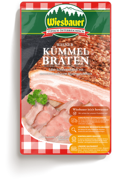 Der hauchdünn vorgeschnittene „Wiener Kümmel Braten“ in der 80g Packung ist innovativ, praktisch und die perfekte Ergänzung für jede Wurstplatte.