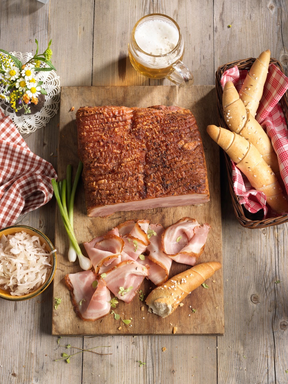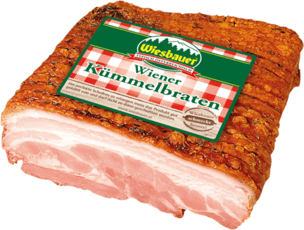 Mild gepökeltes, zart gebratenes, edles, ausgesuchtes Schweine-bauchfleisch mit goldbrauner Kruste. Sorgfältig gewürzt und bis zur Vollendung durchgebraten. Ein deftiges und knuspriges Ge-schmackserlebnis mit herzhaftem Kümmelaroma und ganz ohne Knorpel. Eine alt-österreichische Spezialität mit einzigartigem, unverwechselbarem Bratengeschmack.