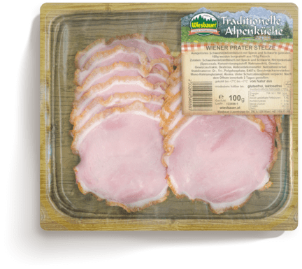 In einem handwerklich aufwändigen Verfahren wird eine nach einem speziellen Rezept gewürzte, mürb gebratene Schweinsstelze, wie man sie in vielen Gaststätten bestellen kann, in einem von Wiesbauer eigens entwickelten und patentierten Verfahren ausgelöst, in eine attraktive Form gebracht und gesliced.