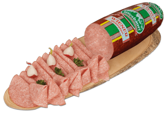 Ausgesuchtes Rind- und Schweinefleisch über aromatischem Buchenholz sorgsam heißgeräuchert (gebraten) ergeben eine würzige und durchgebratene Fleischwurst nach original Wiener Rezeptur.