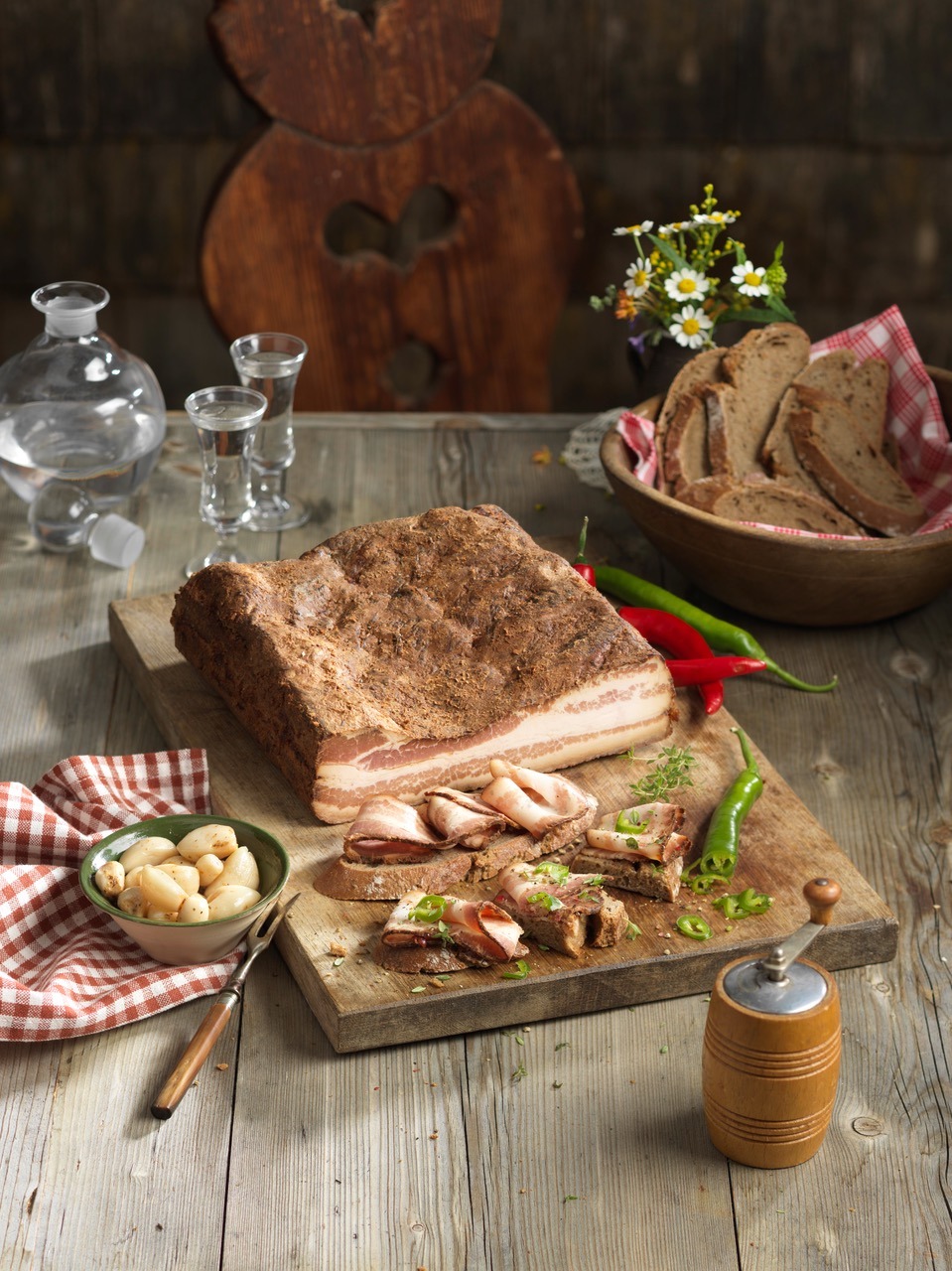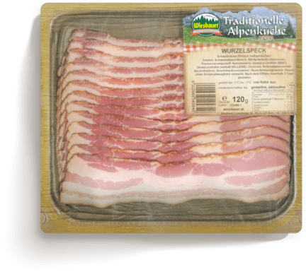 In der „Traditionelle Alpenküche“ gibt es unseren Wurzelspeck auch hauchdünn aufgeschnitten zum direkten Verzehr.