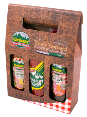 Die Wiesbauer & Schärdinger Geschenksbox enthält eine 250 g-Stange "Bergsteiger mit Bergbaron", eine Packung "Bergsteiger Snack mit Käse", eine 300 g-Stange „Original Bergsteiger“, und eine 250 g-Stange "die Würzige". Abgerundet wird die Geschenksbox mit einem liebevollen Plüschtier, das Groß und Klein ein Lächeln ins Gesicht zaubert.