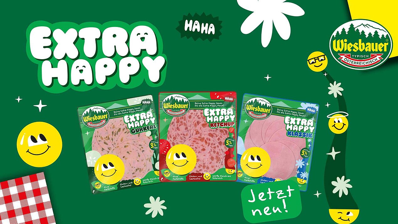 Bei Extra Happy ist der Name Programm: Feinste Extrawurst (Fleischwurst), die nicht nur super schmeckt, sondern gleichzeitig auch für eine Extraportion „Happiness“ sorgt. Ob zur Jause oder als schnelles Abendbrot, Extra Happy ist rundum auf die Vorlieben von Kindern abgestimmt und begeistert in drei verschiedenen Geschmacksvarianten. Viel Spaß und gute Laune verbreitet das fröhlich lächelnde Emoji „Happy“ als Eyecatcher auf den Packungen.