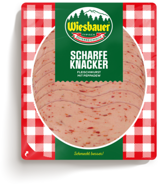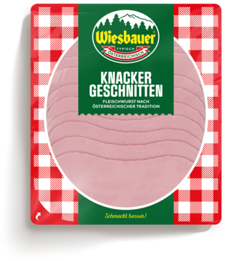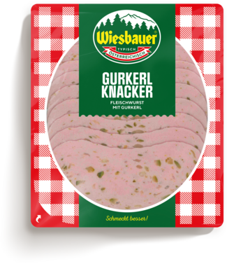 Gebrühte Frischwurst in wasserdampfundurchlässiger Hülle. Geschmackvolle, würzige Wurst mit frischen Essiggurken, unge-räuchert. Eine leichte, milde und feine Wurst in Kombination mit qualitativ hochwertigen Essiggurkenstücken ergibt ein Frische-erlebnis für jede Tageszeit. Feine Gewürze vervollständigen den abgerundeten Geschmack – ohne Zweifel gut und g‘schmackig Biss für Biss.