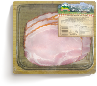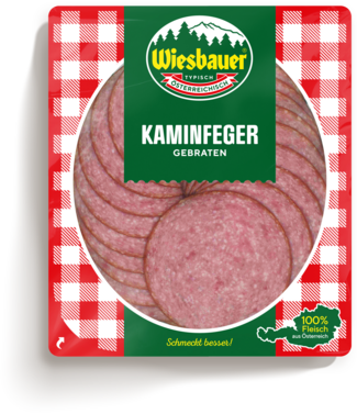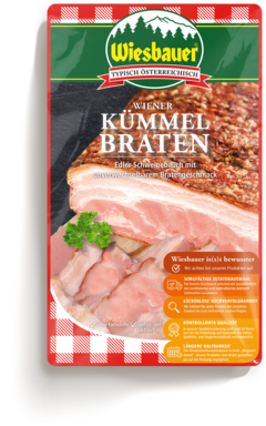 Wurstspezialität aus hochwertigem Schweinefleisch sowie kernigem Speck mit hohem Anteil an Emmentalerkäse- Einlage von der Firma Wiesbauer. Über aromatischem Buchenholz heißgeräuchert.