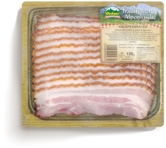 Ausgesuchtes, edles Schweinebauchfleisch mit köstlicher, fleischiger, mild-würziger Schinkenmasse gefüllt. Speziell entwickelte Schnitt- und Verschlusstechniken ermöglichen eine völlig gleichmäßige Verteilung der edlen Schinkenfülle im Bauchfleisch. Dadurch kann auch das letzte "Scherz'l" optimal aufgeschnitten werden.